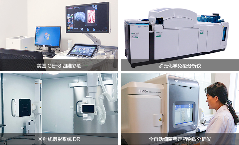 引进高标准先进的设备,美国GE-8四维彩超、德国狼牌宫腹腔镜、罗氏定时荧光定量PCR仪、罗氏全自动生化分析仪及电化学发光仪、数字化X射线摄影系统(DR)、日本奥林巴斯显微镜、全自动血气分析仪、全自动凝血分析仪、全自动细菌鉴定及药敏分析仪、全自动血液细胞分析、酶联免疫检测仪、精子质量分析仪等。